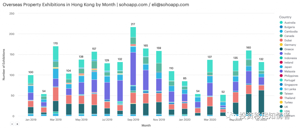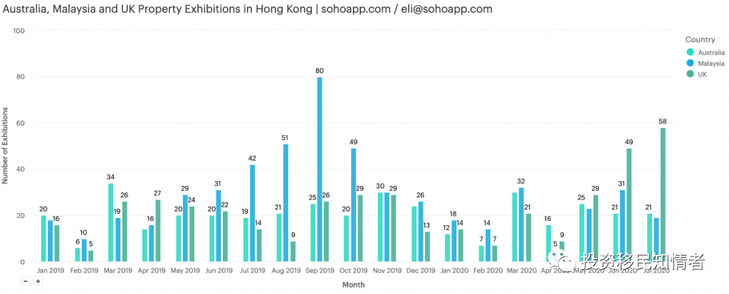 2018年以来,我一直在跟踪海外房产展会的趋势,主要是亚洲的3座城市——新加坡,吉隆坡,还有中国香港。中国香港1月份遭遇疫情,我们看到展会数量下降了,然后3月份回升。吉隆坡和新加坡3月份之前一直都在举办海外房产展会,然后这两个城市都进入隔离了,直到最近7月底才开始启动一对一展会。