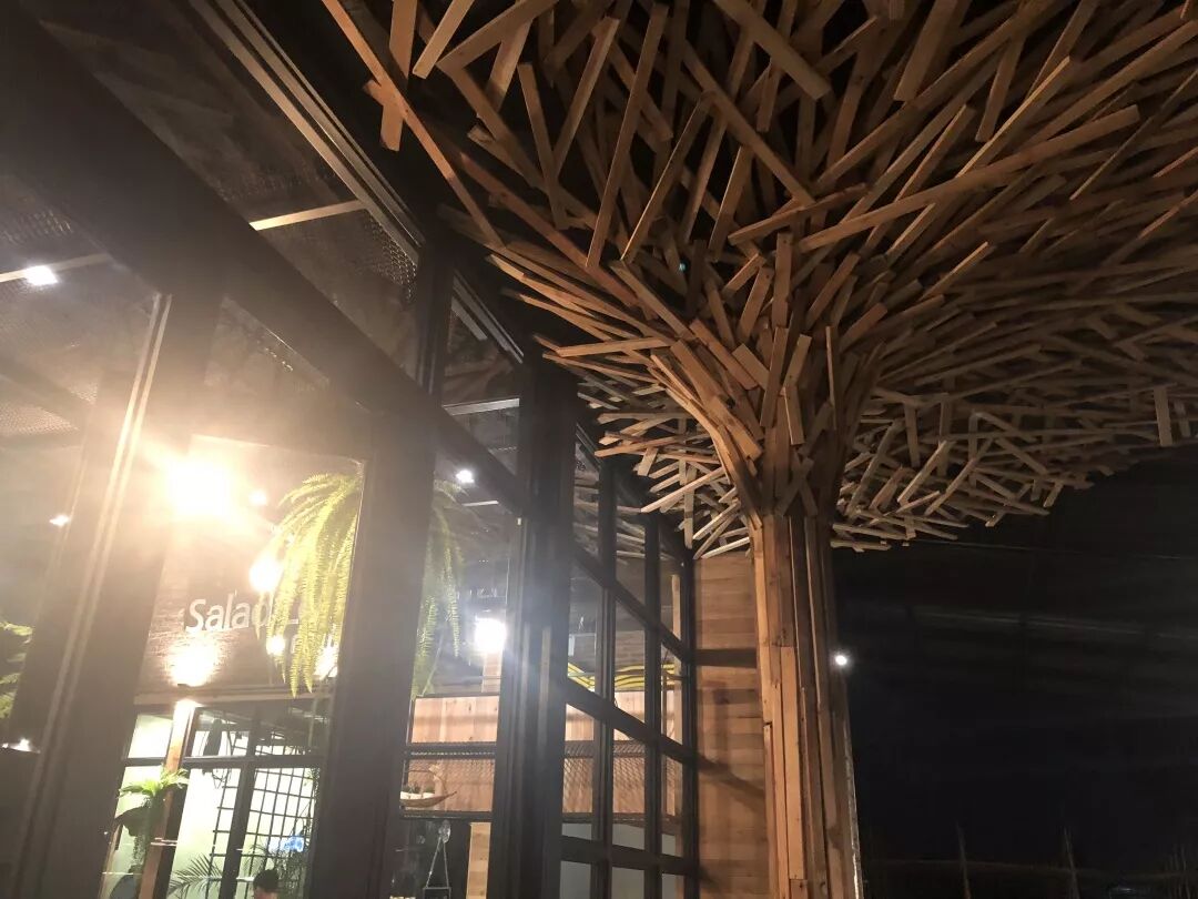WeCafé在装潢方面,有非常独特的一个标志,那就是用同样大小的原色木块,错落钉在廊柱上,一直缓缓向上延伸到房顶,从而组合出一颗巨树的模样。这似乎与WeCafé的基调不谋而合——贴近、尊重自然,又将自然食材解构重组奉至食客眼前。