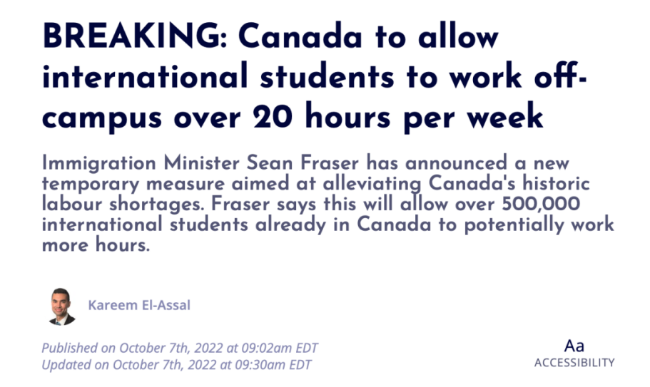 加拿大政府10月7日宣布,将暂时取消国际学生在校外兼职打工的限制政策。