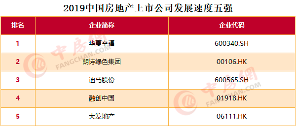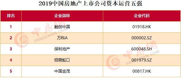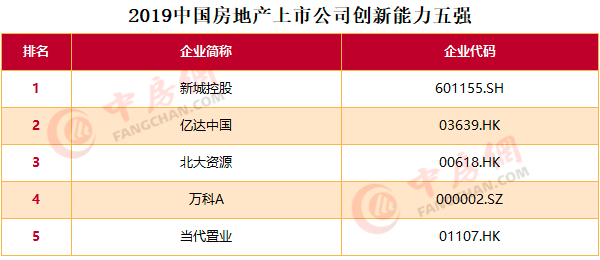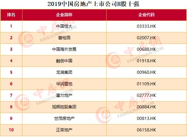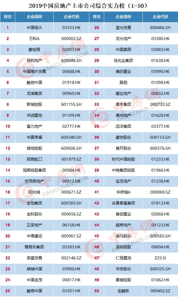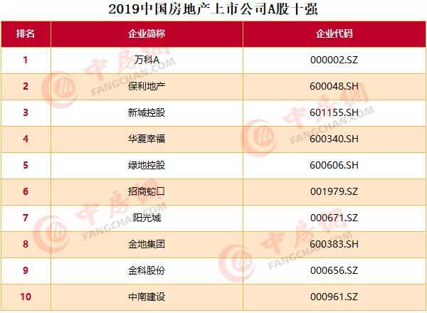 根据《2019中国房地产上市公司测评研究报告》,中国恒大成功蝉联榜首,前三名与2018年一致,依旧为中国恒大、万科A和碧桂园。保利地产、中国海外发展和融创中国分别居于第四到第六位,龙湖集团、新城控股、华润置地和富力地产分列第七至十位。