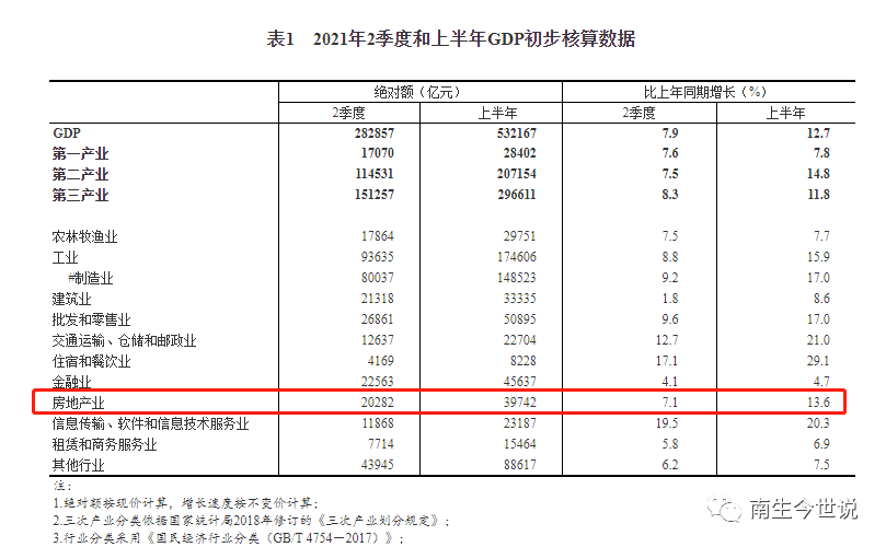 这个问题,实际上国家统计局已经给出答案了——2021年上半年,我国房地产创造的行业GDP约为39742亿元,同比实际增长13.6%(如下图)——增速高于GDP整体水平,表明房地产依然是推动经济增长的主要贡献者之一。